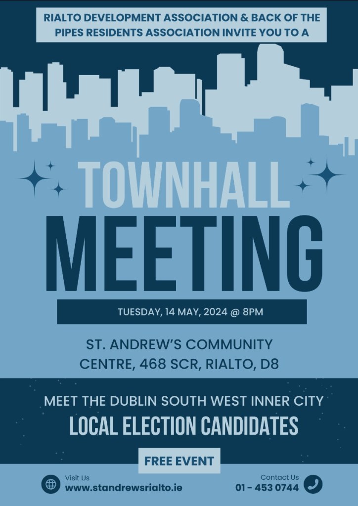 But first up, the Town Hall meeting. This meeting is being organised by Rialto Development Association and local residents’ group, ‘Back of the Pipes Residents Association’. The purpose of the meeting is to allow the public to get to know their local candidates who will be contesting the local government elections on June 7th in the Dublin South West inner city area. The public meeting will take place Tuesday May 14th at 8pm. Residents will have an opportunity to raise concerns and queries in one setting. We hosted a similar meeting in 2019 and it was a great success.