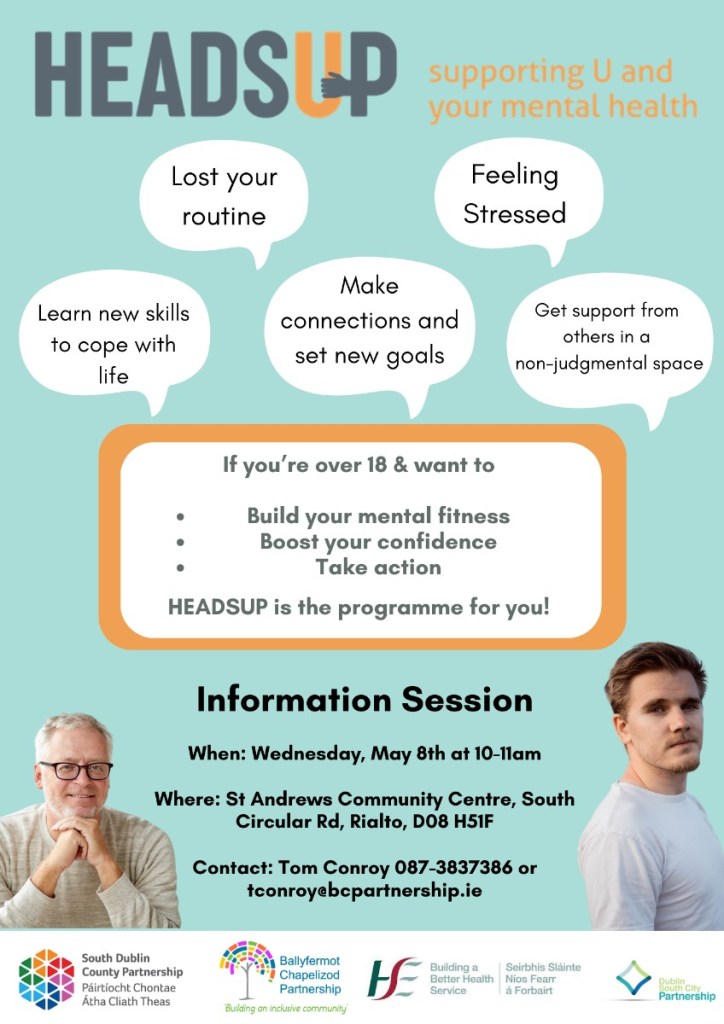There will be a short information session this week in St. Andrew’s about a new programme, aimed at supporting men and their mental health. Maybe this is for you, the man in your life or maybe there is someone you know who could benefit. The course itself is free. If you cannot attend the information session, feel free to ring Tom Conroy, whose contact details are in the poster below.